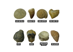 FUN WITH FOSSILS! Fossils include a Mosasaurus tooth, trilobite, shark tooth, shark vertebra, gastropods, and more
