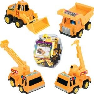 These 4.75 inch construction vehicles have movable parts and free-wheeling action. Die-cast bodies with plastic parts.
